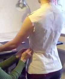 Inserting Front-opening Busk into Corset.